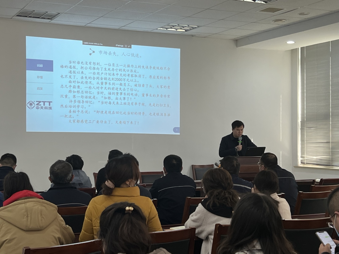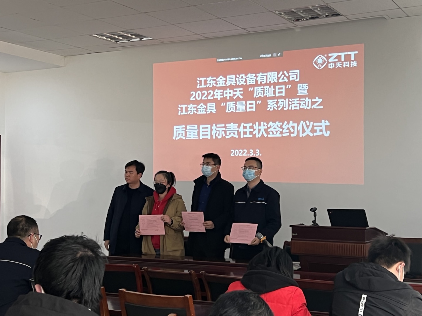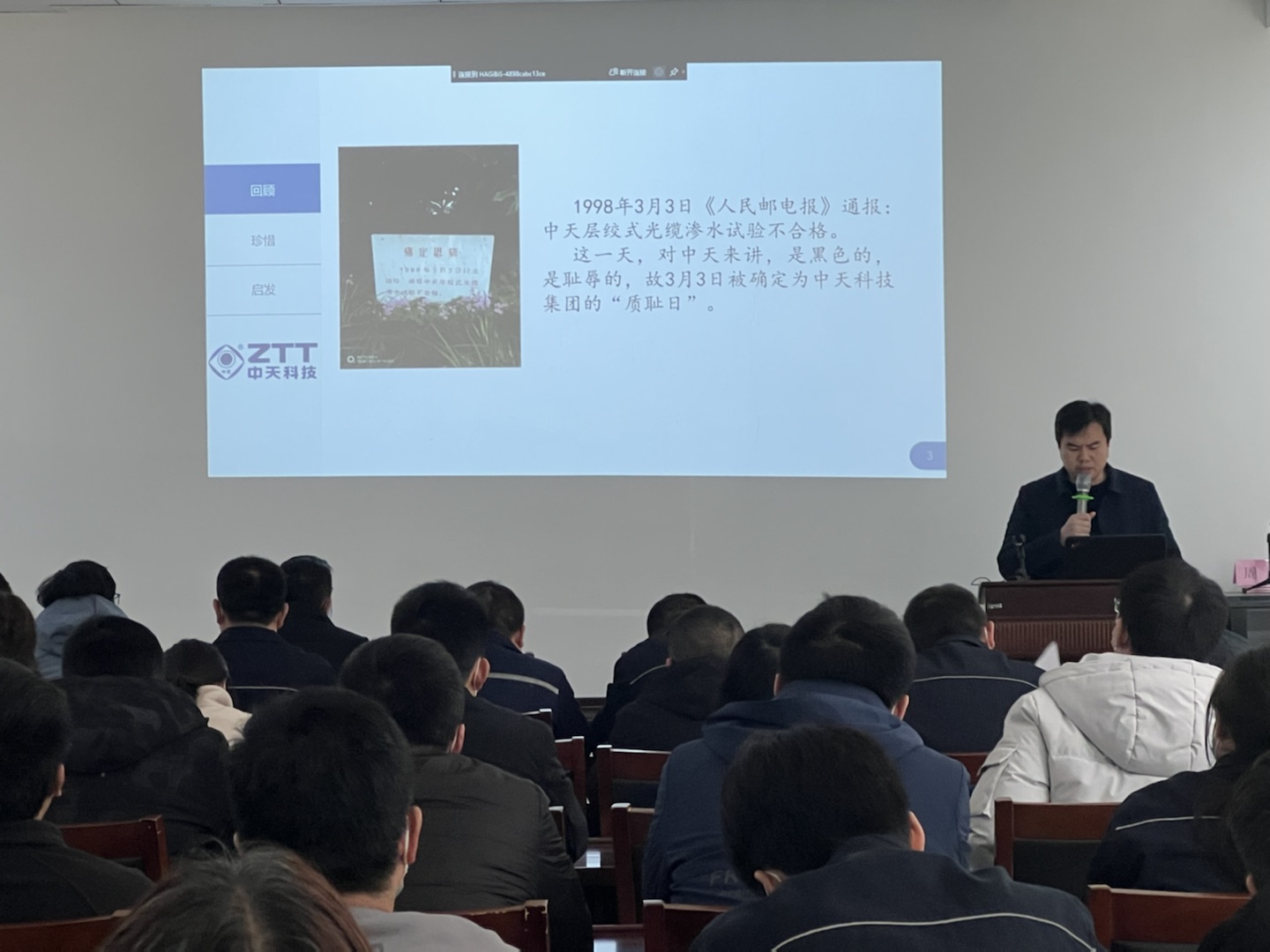 2022年3月3日下午14时,公司全体非一线员工在总经理冒新国的带领下,进行了主题为《1998年渗水试验不合格事故回顾及反思》的培训学习。